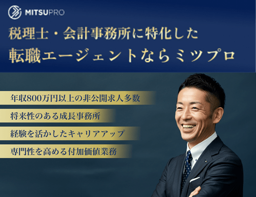 「MITSUPRO(ミツプロ)」は、離職率3%という業界でも稀な定着率を誇る、税理士特化型の転職支援サービスです。給与や残業時間など、一定の基準を満たした“ホワイト求人”のみを厳選して掲載しているため、入社後のミスマッチが少なく、長く働ける環境を紹介してもらえます。 業界経験豊富なエージェントが、税務経験者にはスムーズに、未経験者には丁寧にサポート。履歴書・職務経歴書なしで気軽にカジュアル面談も可能です。 |